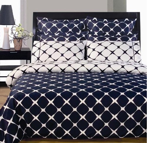 A stunning CONTEMPORARY statement Set inludes 1 KING 106x92 Duvet Cover 1 KING 78x80 fitted sheet with 16 pocket 2 26x26 Euro Shams 2 20x36 King Shams 2 20x36 King Cases Color is NAVY WHITE REVERSIBLE PATTERN Duvet Cover has a reverse button closure for easy on and off of your favo
